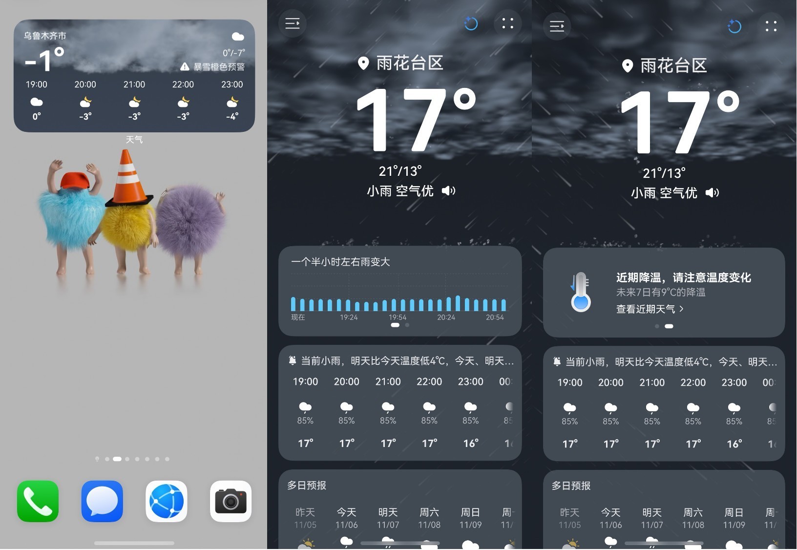 今天恰巧赶上了雨,升级后的桌面天气3DLive卡片里面正飘着细密雨丝,点按进入华为天气,稍稍倾斜手机,雨滴会随着倾斜的角度慢慢流动,互动体验很棒,好像是把窗外雨景搬进了手机里头。